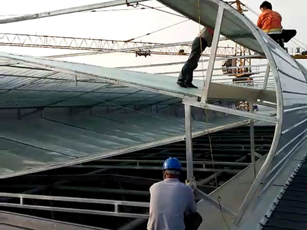 采光通風天窗弧線型外觀設計,由于其優越的通風性能,與傳統的三角形矩形通風天窗相比,在同樣生產設備散熱的情況下,所需通風天窗長度可大大縮短(縮短40%),且結構簡單,造型美觀,尤其與鋼結構彩色壓型鋼板廠房配合,更顯輕盈秀麗.是我廠開發研制的新一代通風產品,該產品在氣流組織上進行了多工況優化試驗,在結構上進行了多次優化改進,改原來的角形結構為流線型結構,是高熱廠房自然通風的理想裝置。